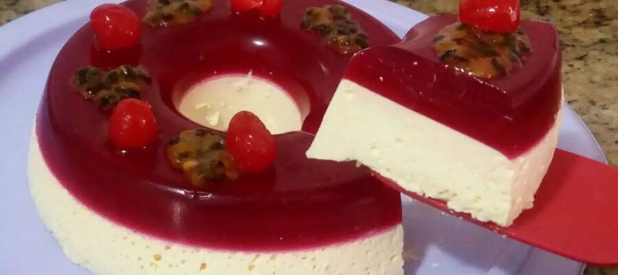 Este postre, que combina gelatina de cereza y maracuyá, da como resultado un plato refrescante y apetecible, ideal para cualquier ocasión. La textura es ligera y cremosa, con capas que se complementan armoniosamente.